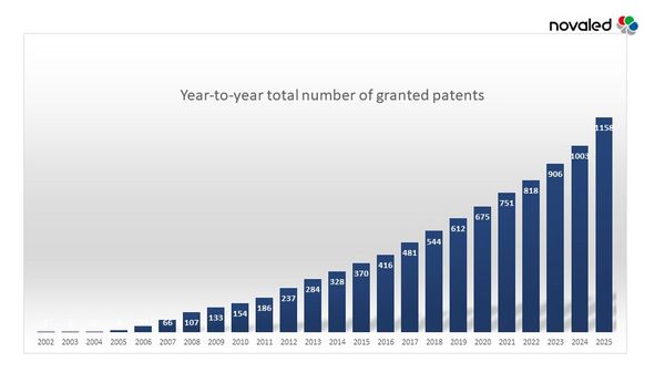 Das rasche Wachstum der von Novaled erteilten Patente sind unten dargestellt. Bis heute wurden > 1000 Patente erteilt.